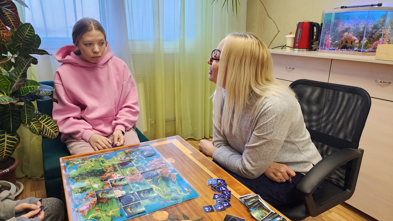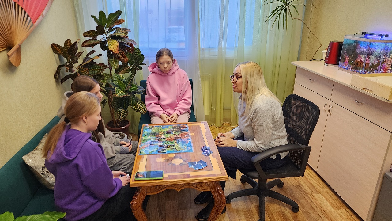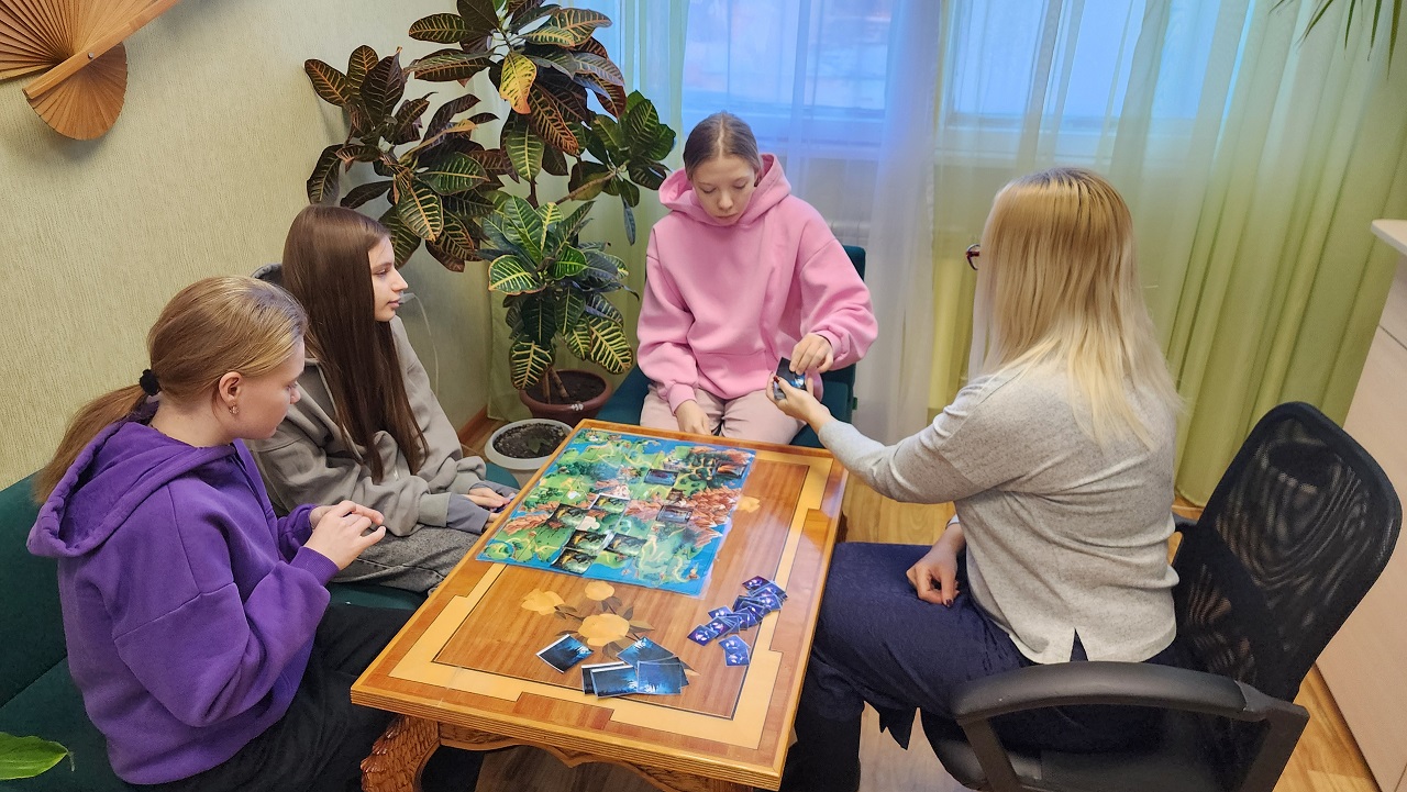 Достижению вышеуказанной цели способствуют занятия с педагогом-психологом. Елена Михайловна Дегтярева проводит различные занятия, тренинги, беседы с детьми, стараясь обновлять методы и приемы. В феврале дети группы ПК-11, играли в настольную психологическую игру «В некотором царстве…». Игра охватывает широкий спектр проблем подросткового возраста: буллинг, сложные отношения с родителями, проблемы с одноклассниками, недовольство своей внешностью, склонность к суициду, курение, употребление алкоголя, неуверенность в себе, страхи и т.д.